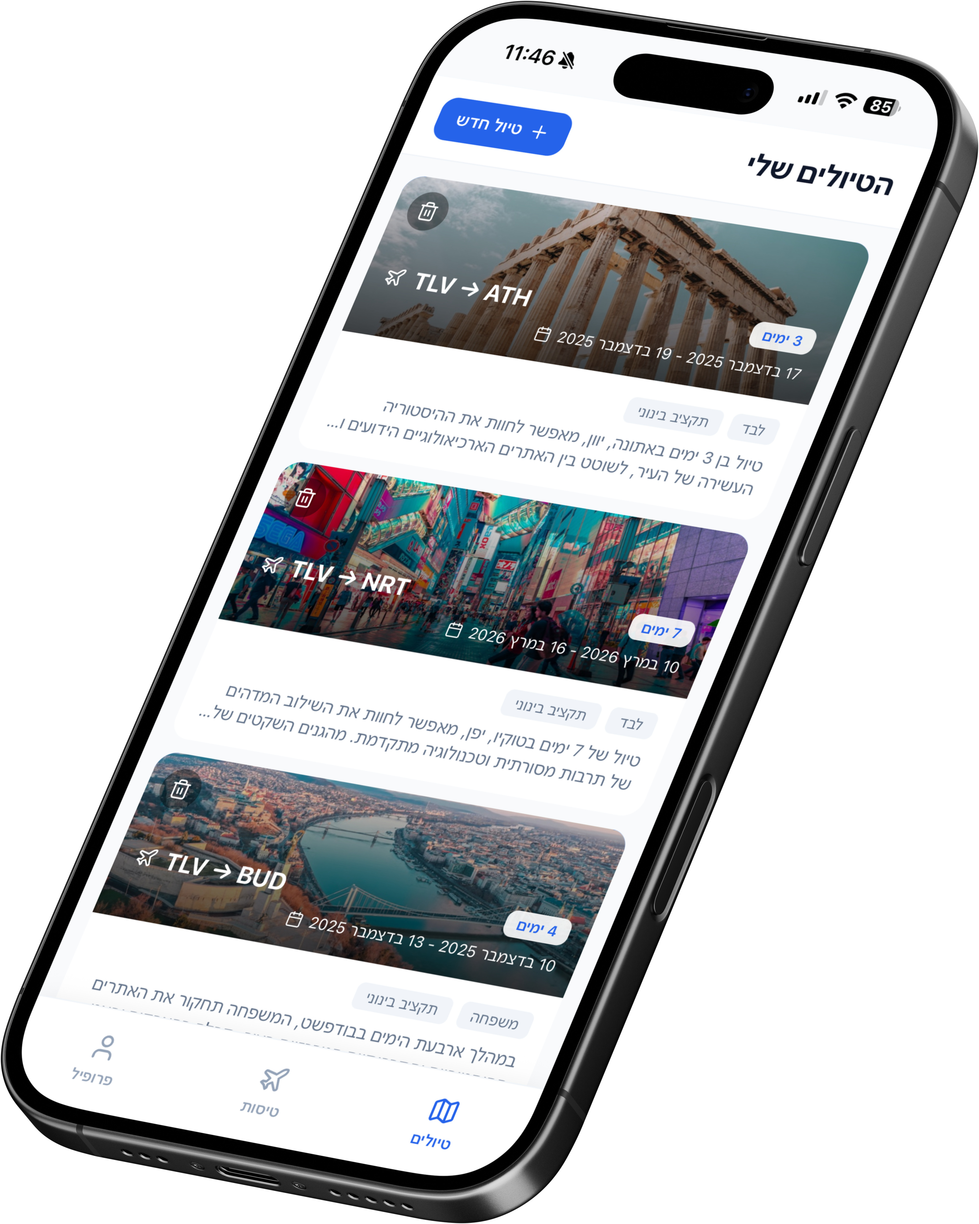 מסלול מפורט שעה-שעה עד 30 יום, מותאם אישית לסגנון שלך. הכל באפליקציה אחת בעברית.